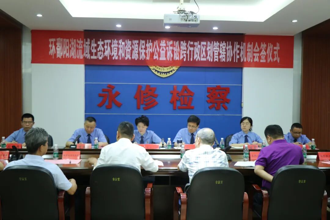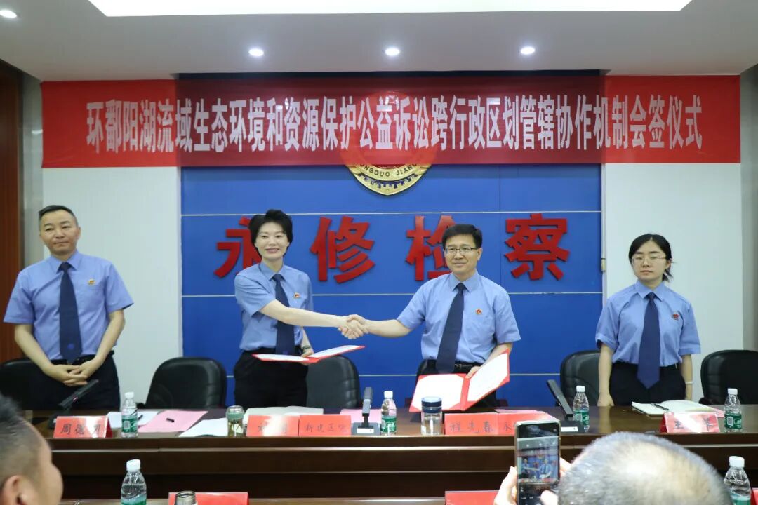 为更好开展环鄱阳湖流域生态环境和资源保护活动,“守牢生态安全底线”,5月10日上午,南昌市新建区检察院和永修县检察院举行《关于环鄱阳湖流域生态环境和资源保护公益诉讼跨行政区划管辖协作备忘录》(以下简称《备忘录》)签约仪式,新建区检察院党组书记、检察长刘娟,永修县检察院党组书记、检察长程先春出席会签仪式。本次会签活动还邀请了两地生态环境局、农业农村局、水利局、林业局相关同志参加。