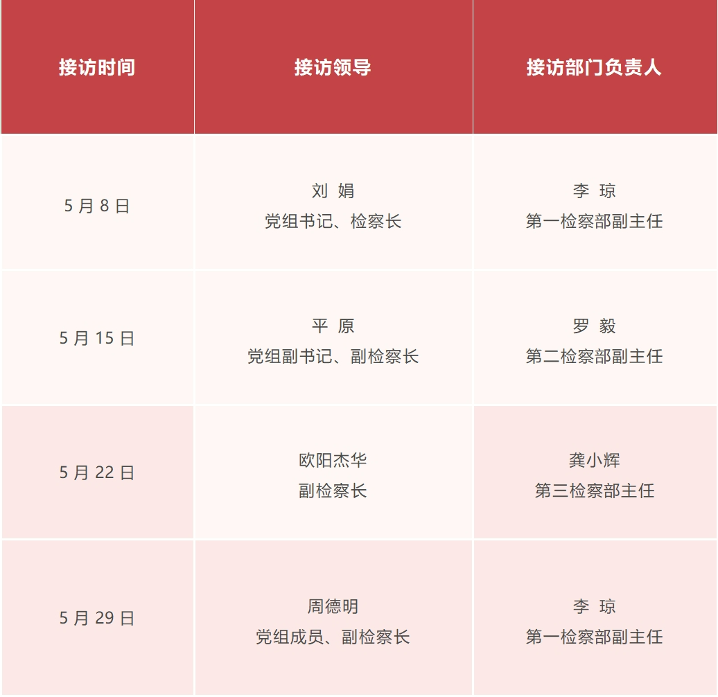 为更好地把握新时代信访工作的重要原则和具体要求,深入践行“以人民为中心”的发展思想,不断提升检察信访工作能力,以高度的政治自觉、法治自觉和检察自觉抓好《信访工作条例》的贯彻落实,努力推动信访工作再上新台阶,现将我院5月份“检察长接访日”安排公告如下: