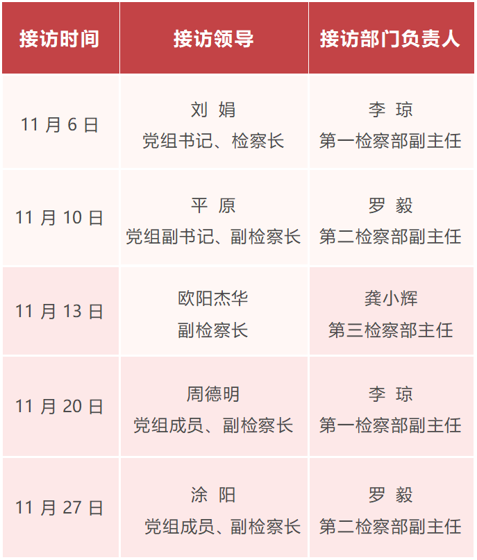 为更好地把握新时代信访工作的重要原则和具体要求,深入践行“以人民为中心”的发展思想,不断提升检察信访工作能力,以高度的政治自觉、法治自觉和检察自觉抓好《信访工作条例》的贯彻落实,努力推动信访工作再上新台阶,现将我院2025年11月份“检察长接访日”安排公告如下: