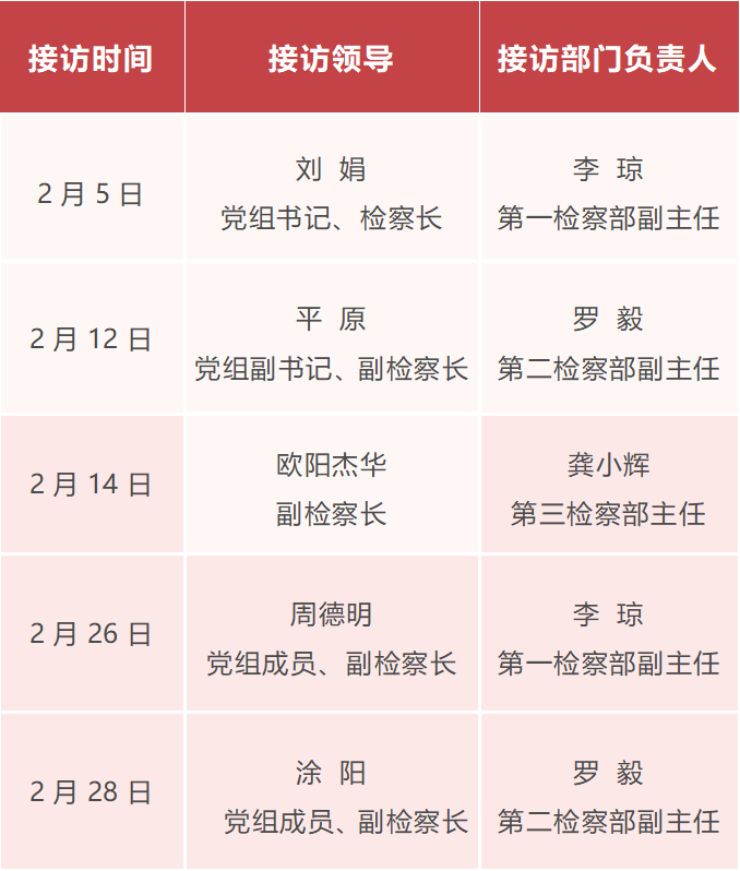 为更好地把握新时代信访工作的重要原则和具体要求,深入践行“以人民为中心”的发展思想,不断提升检察信访工作能力,以高度的政治自觉、法治自觉和检察自觉抓好《信访工作条例》的贯彻落实,努力推动信访工作再上新台阶,现将我院2026年2月份“检察长接访日”安排公告如下: