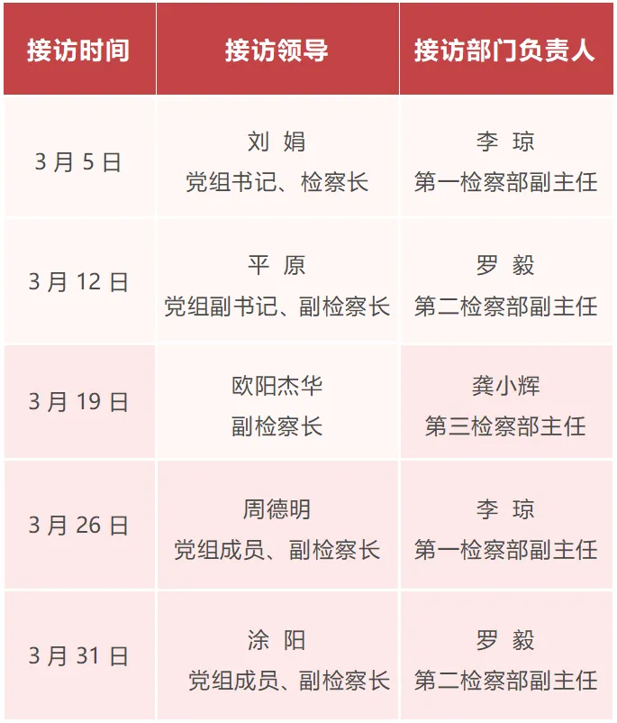 为更好地把握新时代信访工作的重要原则和具体要求,深入践行“以人民为中心”的发展思想,不断提升检察信访工作能力,以高度的政治自觉、法治自觉和检察自觉抓好《信访工作条例》的贯彻落实,努力推动信访工作再上新台阶,现将我院2026年3月份“检察长接访日”安排公告如下: