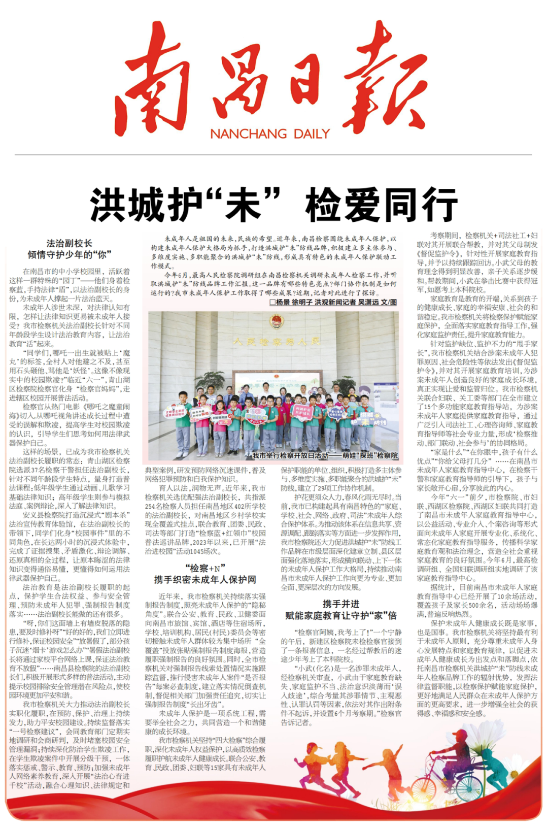 护花更须众人力,春风化雨无尽时。当前,我市已构建起具有南昌特色的“家庭、学校、社会、网络、政府、司法”未成年人综合保护体系。为推动该体系在信息共享、资源调配、跟踪落实等方面进一步发挥作用,我市检察院还大力促进洪城护“未”防线工作品牌在市级层面深化建章立制、县区层面强化落地落实,形成横向联动、上下一体的未成年人保护工作大格局,持续推动南昌市未成年人保护工作向更为专业、更加全面、更深层次的方向发展。