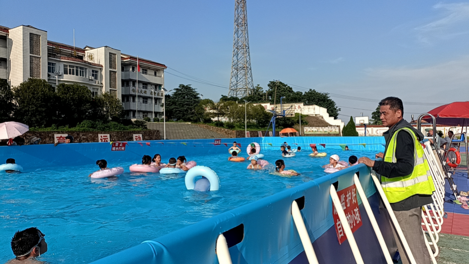 据了解,游泳池每日开放时间为下午4点至晚上7点。为确保安全,当地政府不仅提供免费游泳圈,还对来游泳的孩子们进行详细登记,同时安装了 2 个摄像头进行 24 小时实时监控,并安排安全员、民警、城管队员和医务人员现场巡逻值守,全方位防范溺水事故的发生。“孩子游泳期间,我们还安排了专人培训,让‘水花行动’在农村落地生根。”象山镇党政办副主任缪康介绍,象山镇还加大了对属地危险水域的巡查力度,扎实推进防溺水入户宣传工作。截至目前,全镇已成立23支巡查队伍,在重点危险水域设置“四个一”救援设施113处、警示牌126处,并安装27个智能摄像头,织密防溺水安全网络。