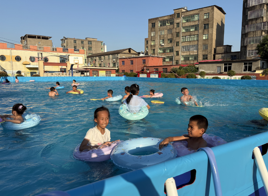 在象山镇,泳池也热闹非凡。占地500平方米的游泳池内,孩子们尽情畅游、嬉戏,现场俨然一片欢乐的海洋。“自从有了这个免费的游泳池后,我们再也不会去户外池塘、水库这些野外水域游泳了,而且这里的安全措施做的非常棒,还有很多小伙伴,我们在这里玩的特别开心。”象山镇学生涂玲玲高兴地说。